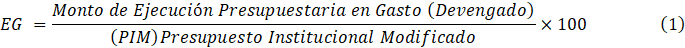 Con respecto a la técnica de estudio, se utilizó análisis documental de fuentes secundarias como medio de información. Para la variable ejecución presupuestaria se recopiló los datos del portal web consulta amigable del Ministerio de Economía finanzas de Perú (MEF), esta plataforma permite acceder a la información sobre la ejecución presupuestaria, las categorías presupuestarias, fuentes de financiamiento y la estructura de gastos de los diferentes niveles de gobierno; una vez identificado los niveles de gobierno se procedió a seleccionar los gobiernos regionales de interés, al mismo tiempo se visualizó las fases de ejecución gasto (certificado, compromiso, devengado y girado) y el presupuesto institucional de apertura (PIA), el presupuesto institucional modificado (PIM) y el nivel de ejecución en porcentual, luego se eligió periodo y en actividades se tomó solo en proyecto, posteriormente bajo la fórmula (1) se halló la eficacia de ejecución del presupuesto.