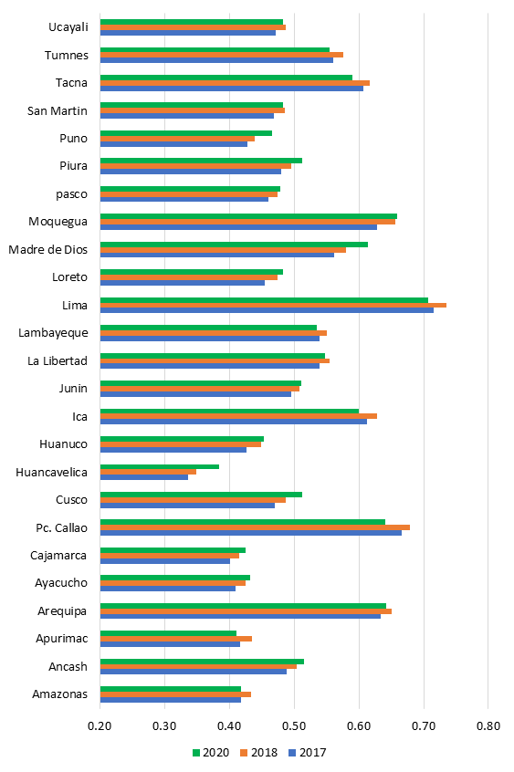 Es importante reconocer que el IDH se calcula a nivel nacional, pero también se puede analizar a nivel departamental, lo que permite identificar variaciones en el desarrollo humano dentro de un país. En el caso Perú en 2017, los datos muestran que Lima Metropolitana tuvo el IDH más alto, con un valor de 0.72, clasificado como "alto" según la escala del PNUD. Seguidamente Moquegua, Provincia Constitucional del Callao, Tacna, Ica y Arequipa con valores dentro de los intervalos 0.500 a 0.699 que corresponde al nivel de desarrollo humano “medio”. Seguidamente, en el año 2018 se evidencia en los resultados que Lima nuevamente presenta altos valores de IDH por encima de 0.7, así como algunos departamentos del sur como Arequipa, Ica, Callao, Moquegua y Tacna, tienen niveles relativamente buenos de IDH, con valores que están por encima de 0.60. Estos valores sugieren que estas regiones tienen una combinación de factores que promueven una vida prolongada, acceso a la educación y un ingreso per cápita favorable para sus habitantes. Finalmente, en el periodo 2019 se observa que Lima mantiene un IDH alto, con un valor de 0.71, lo que indica una continuación en el desarrollo humano significativo en esa área a lo largo de los tres períodos analizados. Ver Figura 1.