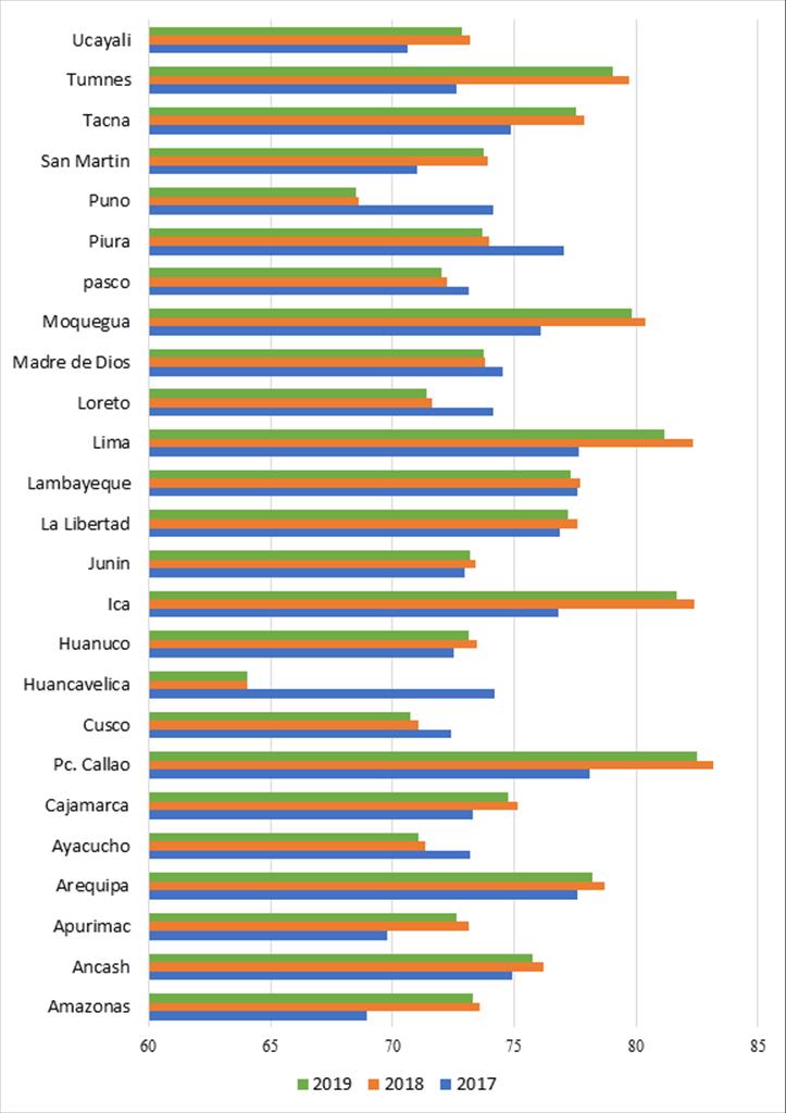 La Figura 2 presenta la esperanza de vida al nacer en diferentes departamentos de Perú, analizados en el período de tres años. Durante los años 2017 y 2019, el promedio de esperanza de vida fue de 74 años, mientras que en el año 2018 fue ligeramente más alto, alcanzando los 75 años. Se observa que algunos departamentos, como la Provincia Constitucional del Callao, Ica, Lima Centro y Moquegua, registraron una esperanza de vida igual o superior a 80 años durante los años 2017 y 2018. En contraste, departamentos como Huancavelica y Puno presentaron una esperanza de vida al nacer inferior a los 70 años.