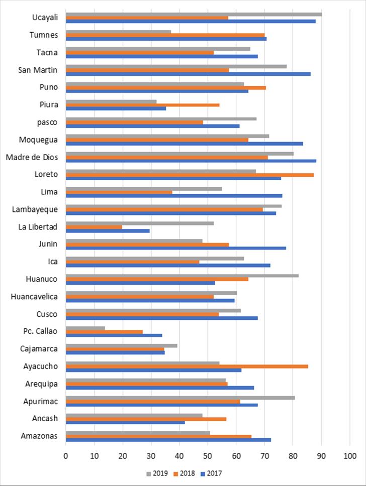 Finalmente, en el año 2019, Ucayali alcanzó un alto nivel de ejecución del presupuesto, llegando al 90%. Esto sugiere una gestión eficiente de los recursos financieros en ese departamento. Madre de Dios logró una ejecución del gasto del 80%, lo que también indica un nivel saludable de utilización de los recursos asignados. Sin embargo, Apurímac mostró una ejecución del gasto del 52%, lo que podría indicar ciertos desafíos en la ejecución o cumplimiento de metas de proyectos y programas en esa región. Es especialmente preocupante la situación en la Provincia Constitucional del Callao, donde la ejecución del gasto es extremadamente baja, alcanzando solo el 14%. Esta baja ejecución del presupuesto puede tener diversas implicaciones negativas, como el retraso en la implementación de proyectos importantes y la falta de servicios públicos para la población.